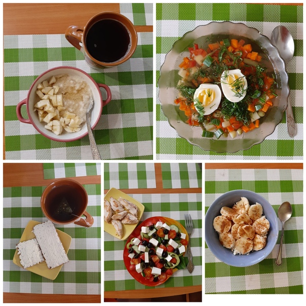 Рацион на 1400 Ккал- овсянка, мед, орехи, кофе с сахаром- овощной суп на куринном бульене, яйцо- ржаной хлебец, творожный сыр, травяной чай- греческий салат, запеченая индейка- творог, банан, корица